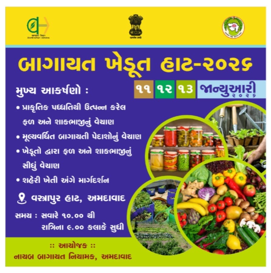 A three-day Horticulture Farmer Haat-2026 will be organised at Vastrapur Haat by the Office of the Deputy Director of Horticulture, Ahmedabad. The event will be held from January 11 to 13 and will showcase a wide range of horticultural and natural farming products. ......